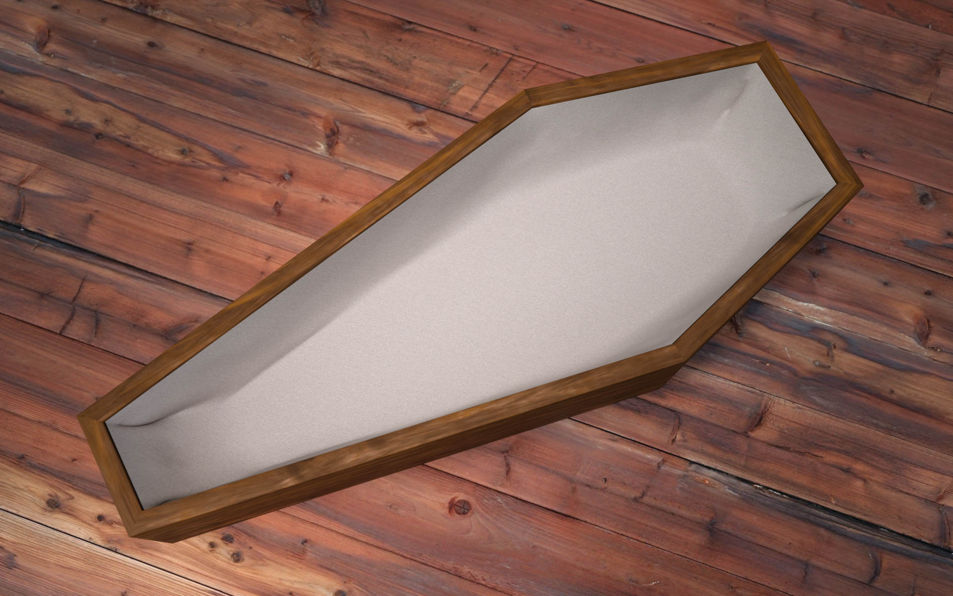 A simple wooden coffin prop, including the wooden coffin body, satin lining, and a character pose adapted for the G8F model.