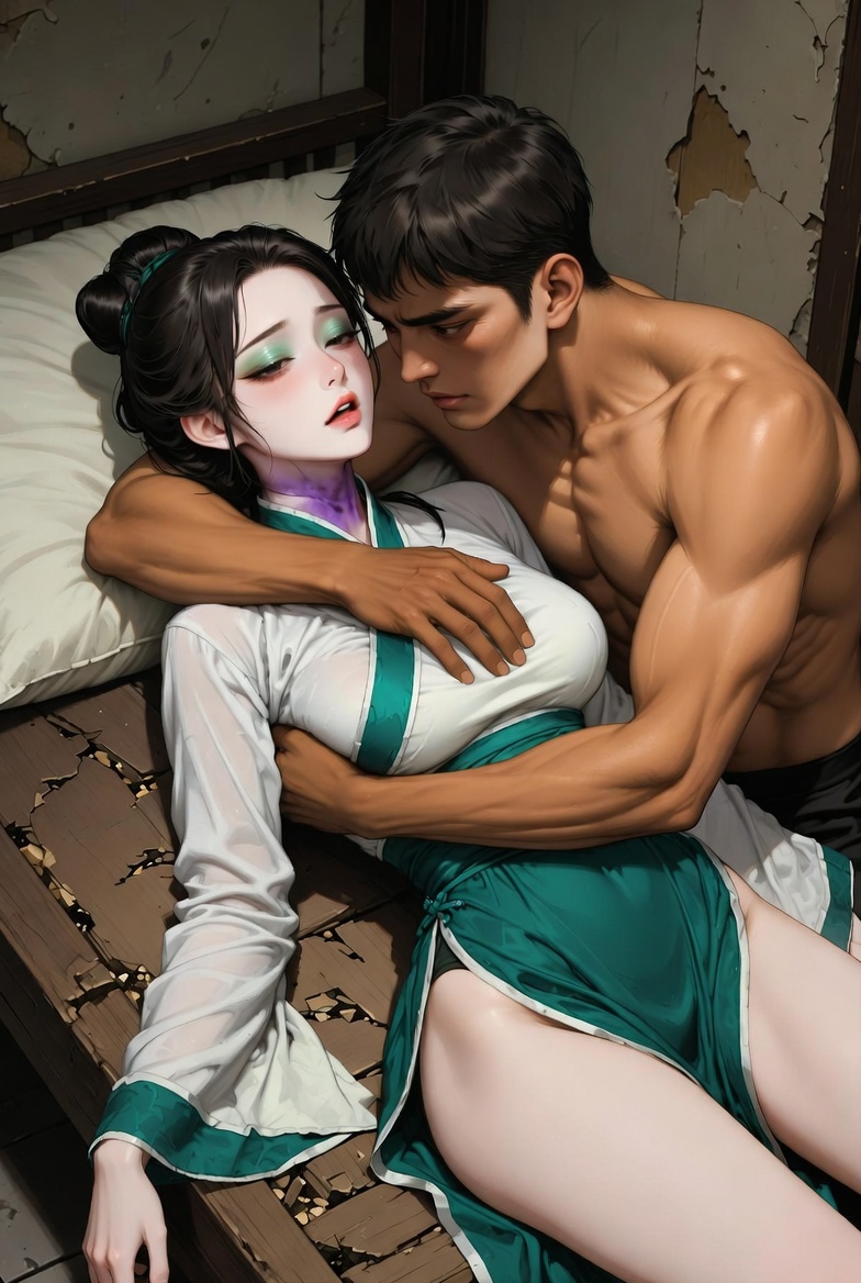 他不敢再耽搁,先把她的身子放平,让头微微后仰,保持气道通畅;又用最厚的棉褥垫高她的腰,使血液更容易回流到头部。接着,他取来一只小铜盆,盛了半盆温水,把软布浸透,一点点拧干,贴在她额头、太阳穴、颈侧动脉处,来回轻拭,降温、活血。每擦一处,他都低声唤一句:“夫人…夫人…醒醒…” 擦到脖颈绳痕时,他动作更轻,几乎只是让湿布贴上去,自己掌心隔着布轻轻按压,怕再多一分力道就让她疼。随后,他又把她的双手拉出来,放在自己掌心搓热,再把温热的掌心覆在她心口,隔着单薄的裙袍,替她捂暖心口的血液。